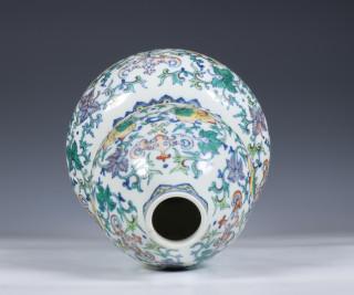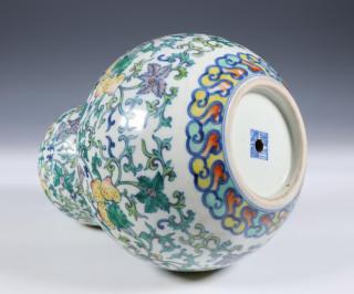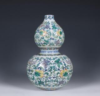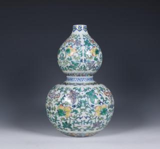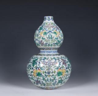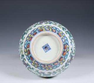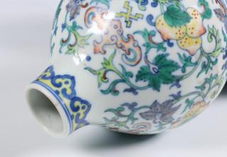 painted overall with scrolling vine, peach and stylised bats, the base with apocryphal Qianlong mark (base drilled through, hairlines, restorations)