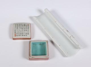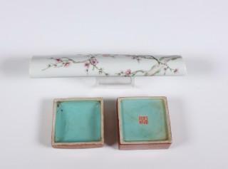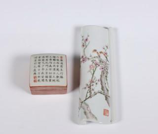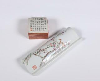 China, iron-red and gilt porcelain calligraphic box and famille rose porcelain wristrest, 20th century,