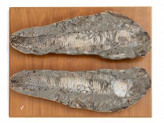 vermoedelijk Vinctifer comptoni, ca 110 miljoen jaar. Dubbelzijdig en gemonteerd op houten wandplaat.