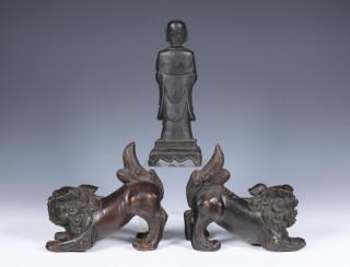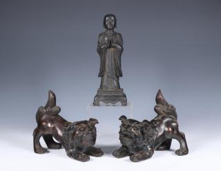 China, pair of bronze Buddhist lions and a model of a monk, 20th century,