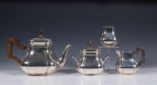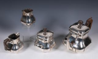 bestaande uit theepot met scharnierende deksel met hardhouten oor en knop, melkkan met houten oor, suikerpot en lepelvaasje, mt. Gerritsen & van Kempen Zeist 1941, 2e gehalte,