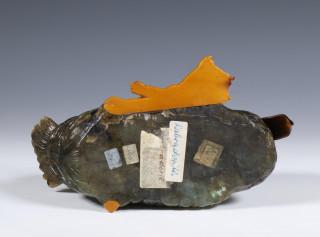 Het lichaam van massief labradoriet, de snavel uitgevoerd in tijgeroog