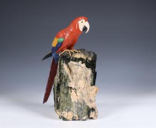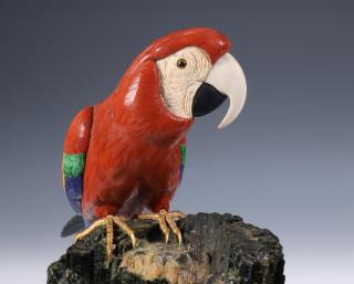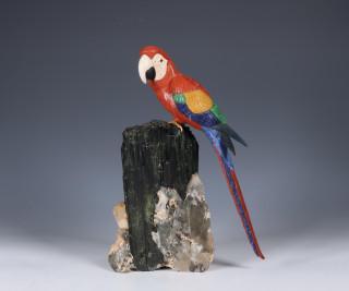 Mineralen sculptuur, papegaai op toermalijn kristal basement, 20e eeuw