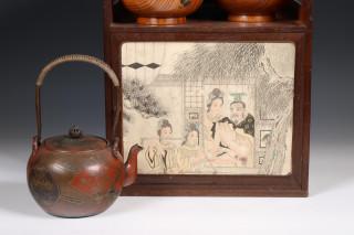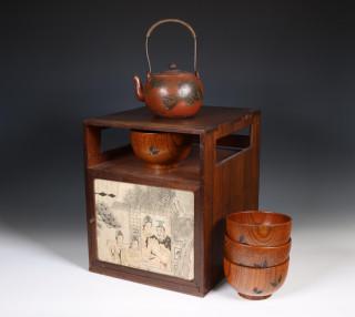 comprising a small cabinet with one drawer and erotic drawing on the door, a set of four wood bowls and a metal teapot (some wear)