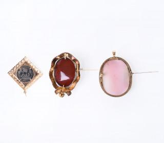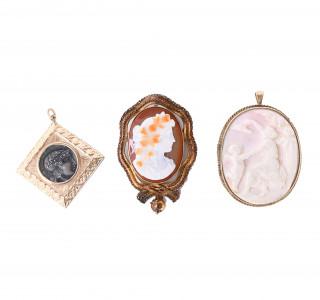 Eén in 18 kt. goud met agaat met een voorstelling van een dame, 19e eeuw, de ander een verguld zilveren broche met schelpcamee met de voorstelling van een dame met een cupido. Hierbij een beneden wettelijk gehalte gouden ruitvormige hanger met in het midden een Romeinse munt (replica)