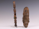 consisting of a two amulet figures bound on a wooden plank, animal part, plant fiber and dark pigments.