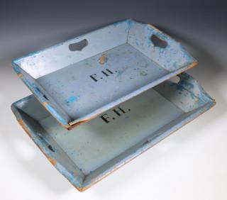 Twee grenenhouten en blauw geschilderde mangelbakken, 19e eeuw;