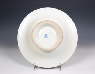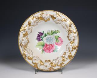 Uitgevoerd met schildering van bloemen en druivenranken vergulde reliëfrand.