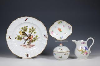 Meissen, vier stuks divers porselein met geschilderd decor van bloemen en vogels, 20e eeuw;