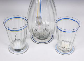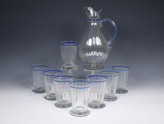 Uitgevoerd met verticaal optiek en email verf lijn decoratie in blauw en geel. Allen gesigneerd. (kan met scheur nabij handvat, vier glazen met chip en een met barst)
