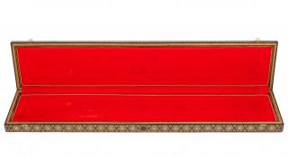Uitgevoerd in khatam kari techniek. Interieur met rode stoffering en uitsparing.