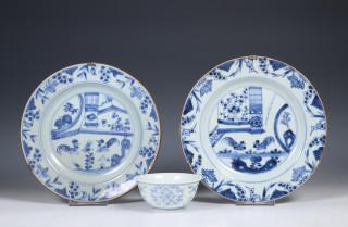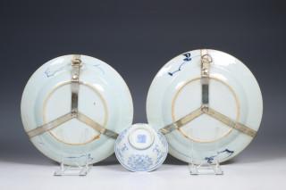 China, blue and white porcelain bowl and a pair of plates, 18th-19th century,