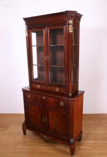 in twee verdelingen. De bovenkast met twee deuren waarin ruiten en lade. Op de overhoekse stijlen kariatiden. De onderkast met lade en twee deuren. Samengesteld