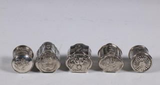 één met voorstelling Adam en Eva, Middelburg ca 1772 mt. niet aanwezig, doosje o.a voorstelling van de Keezen (niet Oranje gezinden), ca. 1790, doosje met voorstelling van vlootvoogd Zoutman, mogelijk Jan Lingenaar Amsterdam 1782(volgens annotatie), mt. niet aangetroffen, divers keurtekens, muntdoosje mt klavervormig, niet geïdentificeerd, Amsterdam 1750 ? en muntdoosje, Noordelijke Nederlanden, ca 1750, enkele met ZII getekend,