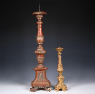 Twee hout gestoken eenlichts kandelaars, 19e eeuw;