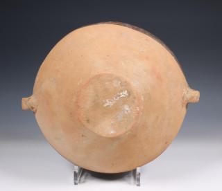 the vessel modelled with wide shoulders and moulded with two loop handles, decorated with crossed bands (some damages and wear as expected)
