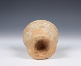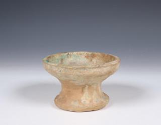 of circular shape with cinched stem, partially covered with an iridescent green glaze (damage and wear as expected)