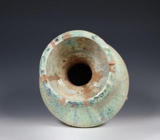 with wide body and long neck with wide mouth rim, covered with an iridescent green glaze (damage and wear as expected)