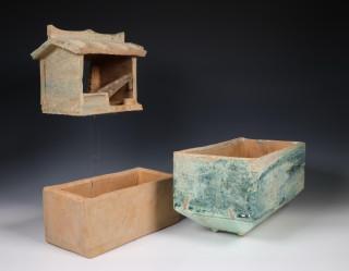 China, green-glazed pottery model of a food container and a an animal pen, Han dynasty (206 BC- 220 AD),