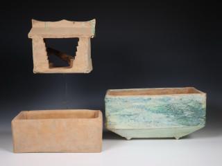 the rectangular container with liner, the pen with sloped roof, both covered with an iridescent green glaze (some damage and wear)