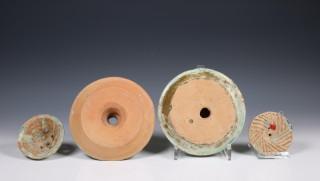 the censer on round stand with narrow stem and mountain cover, the grinder of circular shape, both covered with an iridescent green glaze (both with chips, damage and wear as expected)