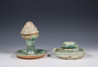 China, green-glazed pottery censer and a grinder, Han dynasty (206 BC- 220 AD),