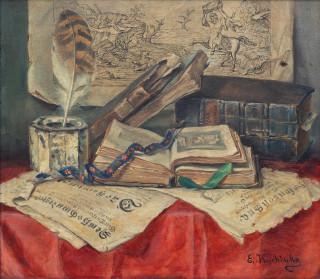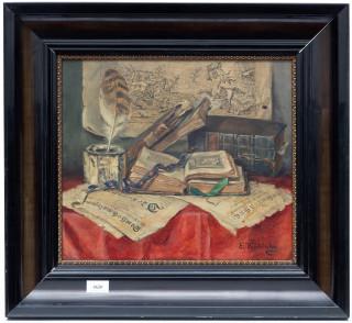 Stilleven met boeken en tekening aan de muur