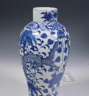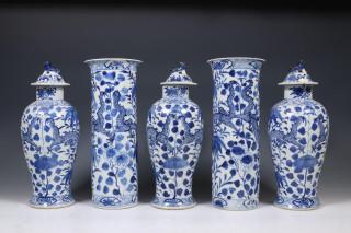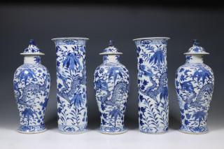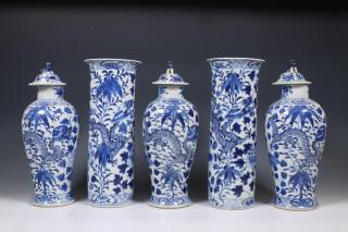 comprising a set of three baluster vases and covers and a pair of cylindrical vases, each decorated with dragons among flowers and with an apocryphal four-character mark to the base (covers and mouth rims with chips)