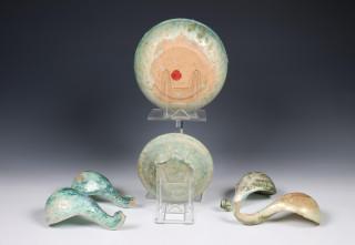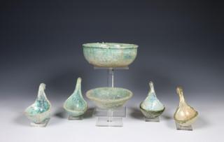 China, four green-glazed pottery spoons and two bowls, Han dynasty (206 BC- 220 AD),