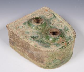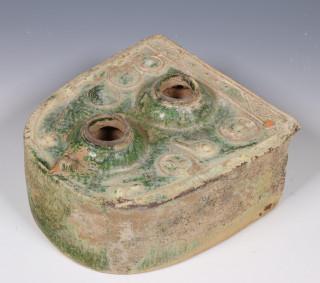 with rounded top and moulded with utensils, covered with an iridescent green glaze (some damage and wear as expected)
