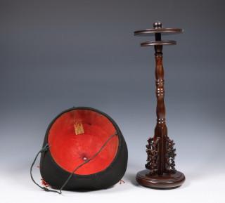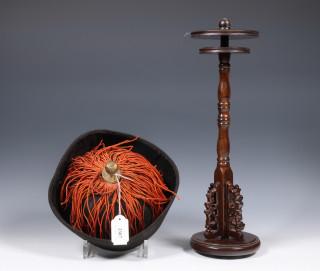 black velvet rim and silk hat topped with red cords and finial, on wood stand (some wear as expected)