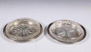 Twee gelijkende flessenonderzetters met kristallen bakjes,