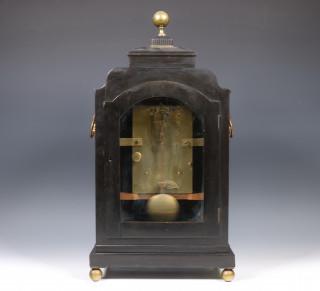 Snekuurwerk met gaand- en slagwerk op bel, repetitie. Wit geschilderde wijzerplaat met 'spade' wijzers. Geheel geplaatst in ebbenhouten en deels gezwarte kast met messing inlegwerk, de zijkanten met messing klank vensters met ruitpatroon. Staande op vier messing bolpoten, bekroond door hood met messing bal. Compleet met slinger.