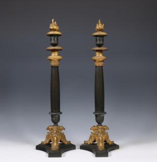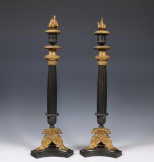Paar zwart gepatineerde en deels vergulde eenlichts kandelaren, ca. 1900;