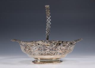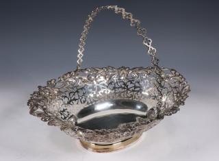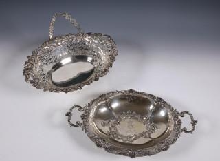 ovale ajour mand met bloem- en bladmotieven versiering en hengsel met rozetvormen, mt. FcE(niet geïdentificeerd) Londen 1885, sterling, schaal met twee grepen in rococo-stijl op vier pootjes, met letter inscriptie en datering 1897, gemerkt 1887-1922,