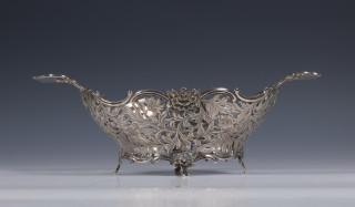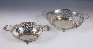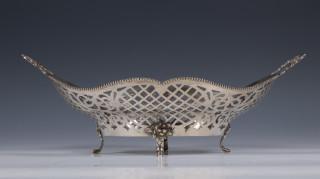 ajour vlechtwerk en gecontourneerd met twee voluutvormige grepen aan weerszijden op vier pootjes, mt. G. Habbeman Blokzijl 1970,2e gehalte en mandje ajour en gegraveerde bloem- bladmotieven en voluutvormige rand op vier pootjes, mt. Zaanlandse Smederij Haarlem/Amsterdam 1955, 2e gehalte,