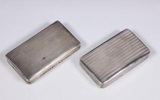 strak geribd langwerpig model met afgeronde hoeken en gegraveerde versiering, naamgravure binnenzijde mt. Pieter van Wingerden Schoonhoven 1822, 2e gehalte en idem model architectonische en bloemmotieven gegraveerd in deksel, mt. C. van Dam Kooijman Schoonhoven 1855, 2e gehalte,