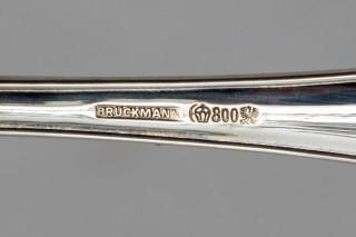 steeluiteinde met gestileerde pied-de-biche, bestaande uit twaalf dinercouverts, twaalf dessertcouverts(met twee maten lepels sets van zes), twaalf dinermessen en twaalf dessertmessen, twaalf taartvorkjes, twaalf koffie- en twaalf theelepeltjes,één koffielepel different en éénentwintig divers opdienlepels-, vorken- en scheppen en drie diverse niet bijpassend gerei, een opdientang en lepel en theelepeltje, mt. Fa. Bruckmann 800ste,