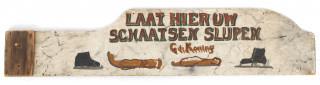 Houten uithangbord, 'Laat hier uw schaatsen slijpen' C. de Koning',