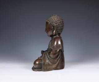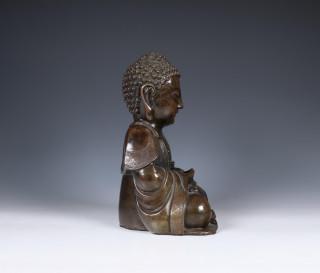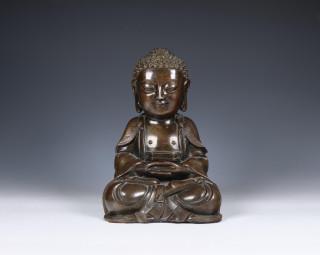 shown seated in dhyanasana with his hands folded in dhyanamudra, meditative expression and wearing long robes incised at the rims, cast with seal mark