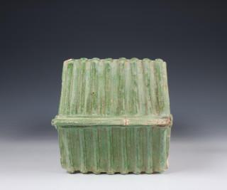 modelled with sloped roof and upstairs windows, partially covered in green and ochre glazes (chips, crack, damages and wear as expected)