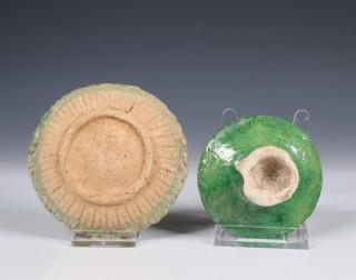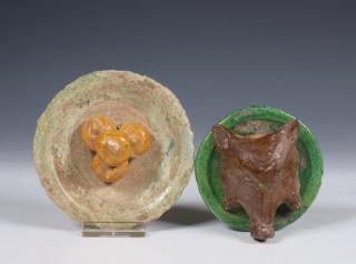 one of a boar's head on a dish and the other with cakes on a dish, covered in ochre, green and aubergine glazes (damages and wear as expected)