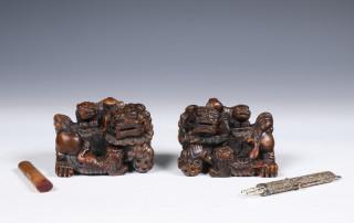 comprising a pair of wood models of buddhist lions, a silver pencil case for two pencils and a boxwood seal 'Shu zongfu' (minor wear)