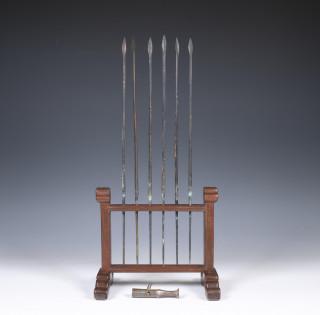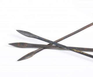 China, six bronze arrow points, Warring States period (475-221 BC) and a bronze parasol finial, Han dynasty (206 BC- 220 AD),