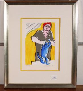 Vrouw met kat. Hierbij rotaprent door Aat Veldhoen en ets door Rup