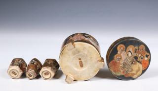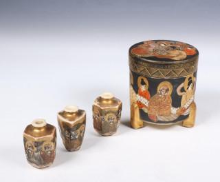 comprising a cylindrical box and cover and three miniature vases, all decorated with figures (cover and one vase with chip, all with surface wear)