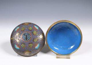 the cover inlaid with central shou-character surrounded by flower scrolls repeated on the box, the interior covered in blue enamels (some wear as expected)