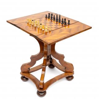 Het blad in twee delen te openen waaronder geparqueteerd schaakveld, weerszijde met gespiegelde parqueterie inleg. Lade onder het blad. Geheel staande op vier gebogen poten met marqueterie, gedragen door vier verbonden regels op bolpoten. (hierbij houten schaakspel)