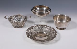 ajour mandje mt. Fa. J. M van Kempen Voorschoten 1858-1924, twee kommetjes, mt. Zilverfabriek Voorschoten, Voorschoten 1925 en 1934, alle 2e gehalte. Hierbij twee onedele mandjes,