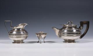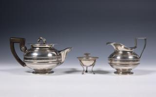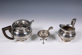 Theepot en melkkan, Biedermeier en theezeefje met lekbakje,